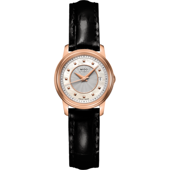 Женские часы. Индикация часов, минут, секунд центральными стрелками. Окошко даты в положении 3 часа. Циферблат украшен узором гильоше и натуральным перламутром.