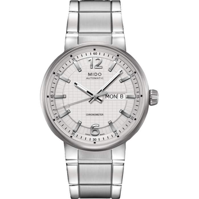 Стильные мужские часы. Хронометр C.O.S.C. Индикация часов, минут и секунд центральными стрелками. Окошко даты дня недели в положении 3 часа. Циферблат выполнен с узором гильоше.