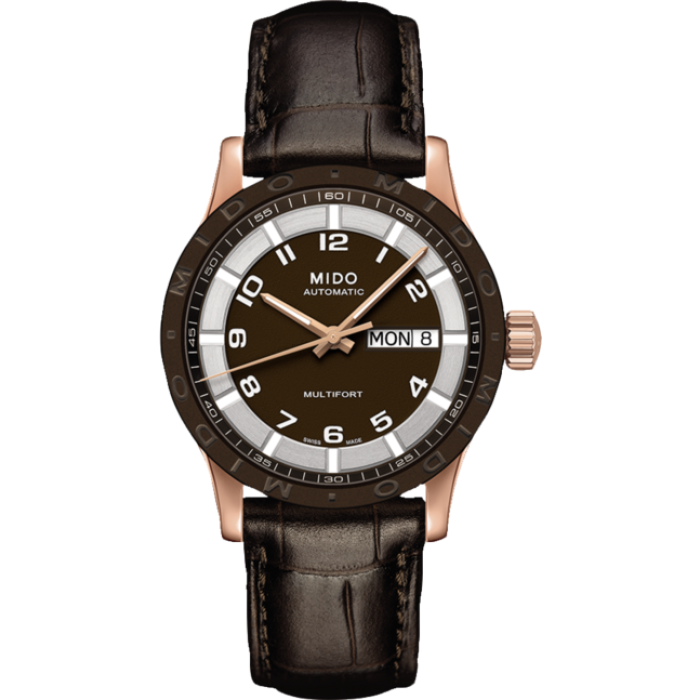 Мужские часы. Индикация часов, минут, секунд центральными стрелками. Окошко даты и дня недели в положении 3 часа. Безель с гравировкой бренда.
