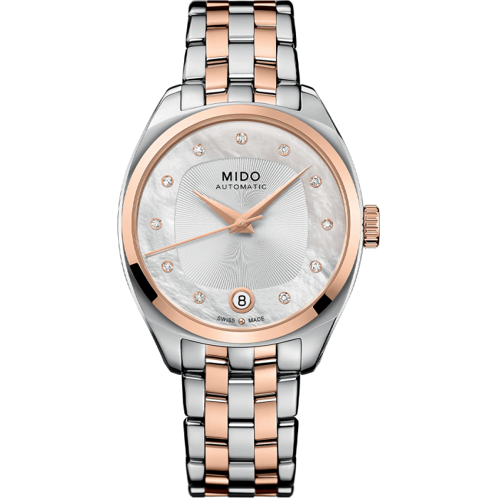 Belluna Royal Lady Коллекция Belluna Royal Lady отличается корпусом в форме кушона, а также, гильошированным циферблатом в узоре солнечного луча, украшенного бриллиантами. Женская механическая модель с автоподзаводом. Окошко даты в районе 6 часов.