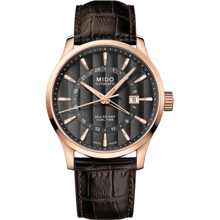 Multifort Dual Time GMT Мужская модель с индикацией второго часового пояса GMT, окошко даты в положении 3 часа. Циферблат украшает гильоше "женевские полосы". Прозрачная задняя крышка.