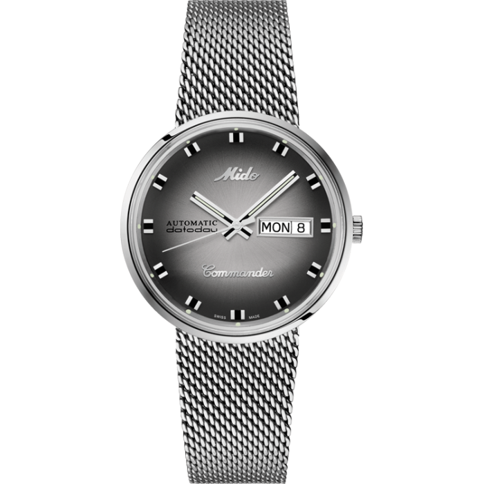 Часы для любителей ретро-стиля. Четкие формы, браслет из миланского плетения, циферблат с узором Sunray, четкая контрастная разметка, заводная головка с системой Aquadura.