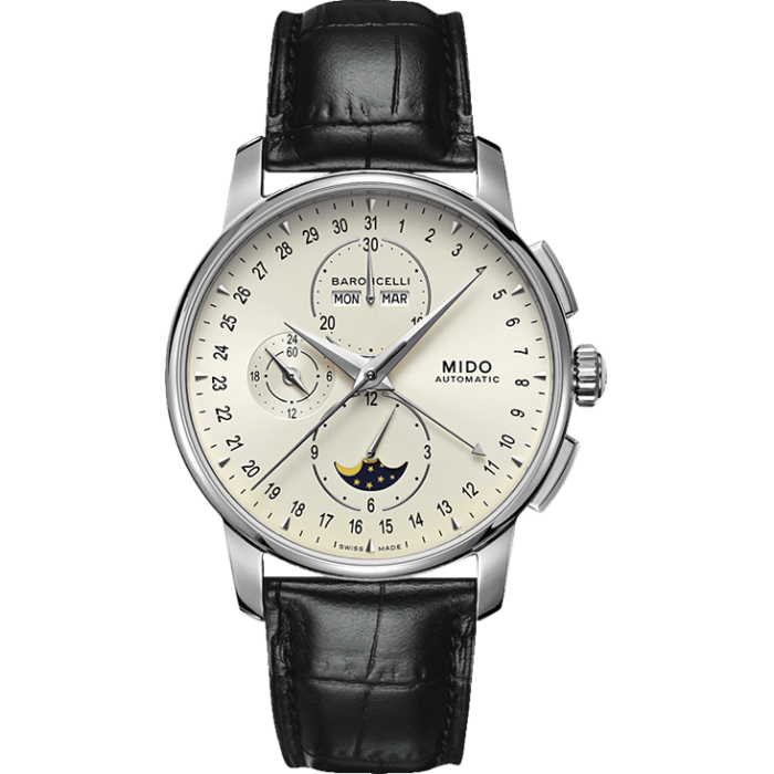 Baroncelli Moonphase Современная классика для мужчин. В модели есть хронограф, 12-часовой счетчик расположен на 6 часов, 30-минутный на 12 часов и малая секунда на 9 часов. Центральная стрелка-указатель даты, апертура месяца и дня недели лаконично расположена на 12 часов.
