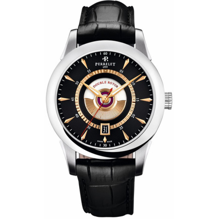 Часы Perrelet - надёжный ориентир во времени. Данная модель A1006/11 входит в коллекцию Double Rotor. Производство - Швейцария. Часы Перле являются солидным аксессуаром, подчёркивающим ваш вкус. В данной модели тип калибра - механический. В качестве материала корпуса используется сталь. Часы с удобным ремнём. На циферблате есть указатель даты. Размер часов D 40 мм.