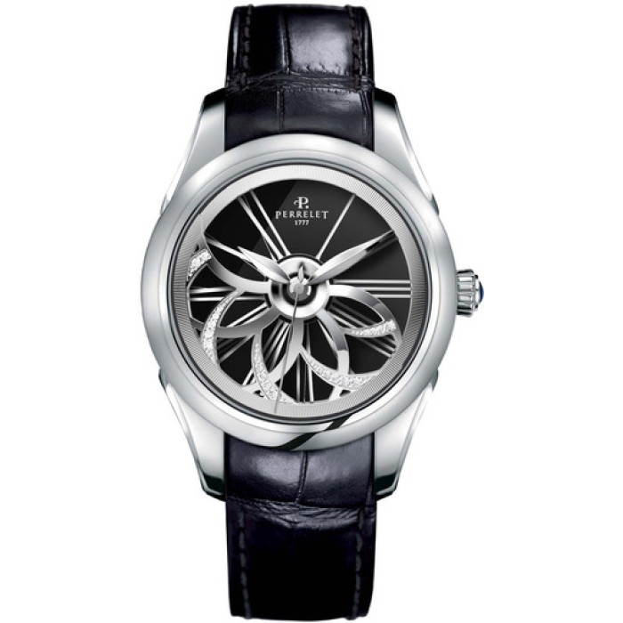 Часы Perrelet - надёжный ориентир во времени. Данная модель A2065/5 входит в коллекцию Diamond Flower. Производство - Швейцария. Часы Перреле станут жемчужиной в коллекции аксессуаров любительницы ярких и стильных вещей. Стильные и яркие часы. Материал корпуса - сталь. Часы с удобным ремнём. В качестве украшения используются бриллианты. Цвет ремня - черный. Размер часов D 37 мм.
