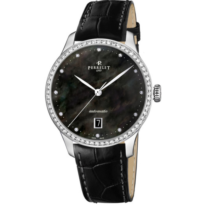 Швейцарские часы Perrelet, A2049/2P из коллекции First Class. Часы Перле никогда не выйдут из моды, поскольку представляют собой олицетворение классики. Удобные часы, тип калибра - механический. В качестве материала корпуса используется сталь. Материалом ремня является кожа. Часы украшены бриллиантами. Также в часах имеется указатель даты. Размер часов D 38 мм.