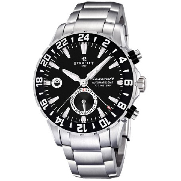 Представляем вашему вниманию часы фирмы Perrelet, артикул A1055/BU. Родиной этой фирмы является Швейцария. Данная модель Перле - выбор активного, целеустремлённого человека, для которого любое препятствие по плечу. Механические спортивные часы. Материал браслета и корпуса - сталь. Стекло сапфировое. Среди прочих преимуществ часов - их водостойкость. Индикатор GMT позволяет следить за временем в разных часовых поясах. Габариты корпуса - D 42 мм.