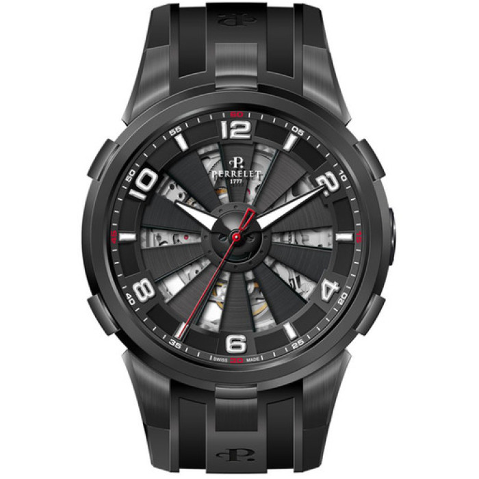 Perrelet - бренд из Швейцарии, получивший всемирную известность. Данные часы (Turbine A1081/1) - яркие его представители. Часы Перреле являются прекрасным выбором для любителей подчеркнуть свою индивидуальность. Яркой деталью, выделяющей эти часы является скелетон. Как материал корпуса используется сталь. Материалом ремня является каучук. Для украшения корпуса используется pvd покрытие. Цвет ремня - черный. Размер часов D 44 мм.