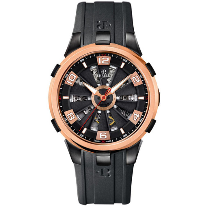 Представляем вам часы Perrelet, страна производства Швейцария. Артикул A3038/1A относится к коллекции Turbine. Сочетание мужественности и элегантности, часы Перле - выбор современного мужчины. Модные часы-скелетоны. Как материал корпуса используется золото и сталь. Материалом ремня является кожа. Для украшения корпуса используется pvd покрытие. Цвет ремня - черный. Размер часов D 44 мм.