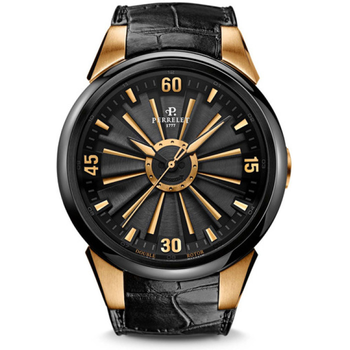 Perrelet - бренд из Швейцарии, получивший всемирную известность. Данные часы (Turbine A8080/1) - яркие его представители. Хотите выделить свой образ даже на модном мероприятии? Тогда часы Перле для вас! Стильные и яркие часы. Материал корпуса - золото и сталь. Часы с удобным ремнём. Для украшения корпуса используется pvd покрытие. Цвет ремня - черный. Габариты корпуса - D 44 мм.