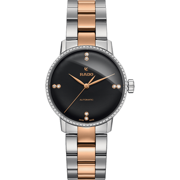 Женская модель, индикация часов, минут и секунд центральными стрелками. Безель украшен 72 бриллиантами 0.259 ct, на циферблат 8 бриллиантов 0.052 ct