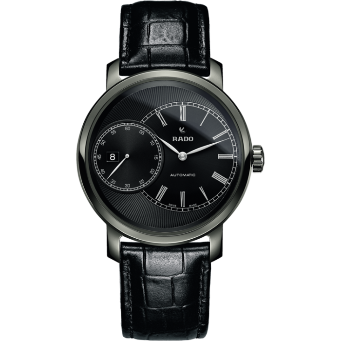 DiaMaster Grande Seconde Мужская модель, часовая и минутные стрелки смещены в положение 3 часов, вынесенная секундная стрелка в положении 9 часов, окошко даты в положении 9 часов.