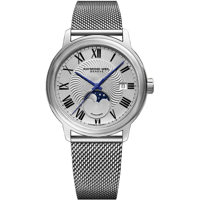 Швейцарские часы Raymond Weil Maestro 2239M-ST-00659 с классическим дизайном предназначенные для мужчин. В этих престижных часах реализовано одно из самых красивых и востребованных усложнений: индикация фазы Луны - Moon Phase. Механизм с автоматическим подзаводом произведен в Швейцарии, декорирован и персонализирован компанией Raymond Weil. Круглый корпус из нержавеющей стали дополнен плетеным миланским браслетом. Сапфировое стекло защищает циферблат с гильошированием и установлено в прозрачном окне на задней крышке.
