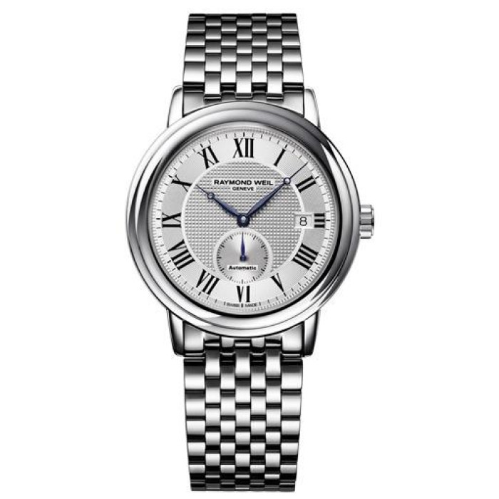 Швейцарские часы Raymond Weil, 2838-ST-00659 из коллекции Maestro. Прекрасный образец классических часов Раймонд Велл для людей, ценящих, в первую очередь, своё время. Удобные часы, тип калибра - механический с автоподзаводом. Материалом корпуса и браслета является сталь. На циферблате есть указатель даты. Размер часов D 40 мм.