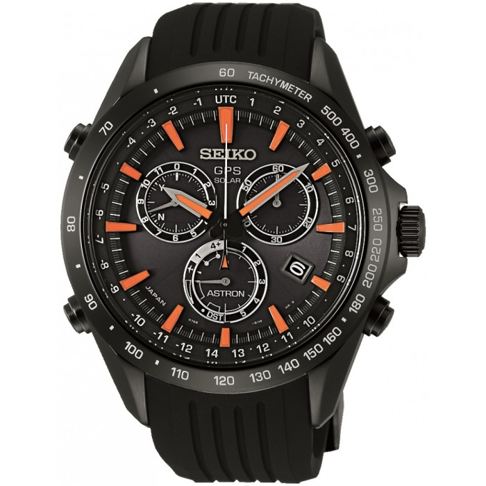 Кварцевые часы с питанием от солнечной энергии. Хронограф рассчитан на 6 часов измерения с шагом в 1/5 секунды. Настройка точного времени и часового пояса по GPS, с возможностью ручного выбора из 39 поясов. Вечный календарь до 2100 года. Сапфировое стекло с антибликовым покрытием. Силиконовый ремешок с тройной раскладывающейся застежкой. Корпус диаметром 44 мм из нержавеющей стали с керамическим безелем.