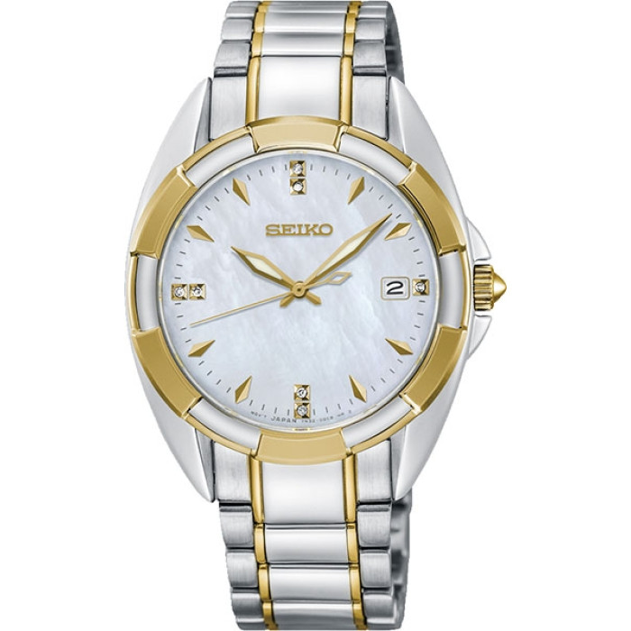 Японские часы Seiko CS Dress SKK886P1. Женские наручные кварцевые часы в круглом корпусе из нержавеющей стали с частичным PVD-покрытием. Калибр 7N32. Благодаря повышенной водозащите (100 м) в этих часах можно плавать и нырять с трубкой. Белый перламутровый циферблат украшен 7 бриллиантами и надежно защищен от царапин сапфировым стеклом. Имеется индикатор даты, а также часовая, минутная и секундная стрелки. Стальной браслет с частичным PVD-покрытием, раскладывающаяся застежка с системой блокировки. Заводная головка с защитой. Красивые часы для современных и элегантных женщин.