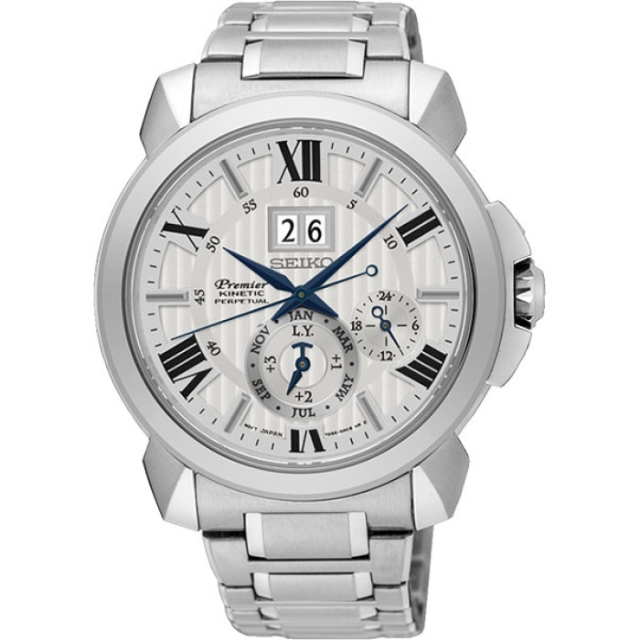 Мужские наручные автокварцевые часы в круглом корпусе из прочной нержавеющей стали. Собственный калибр 7D56. Автоматическая генераторная система Seiko Kinetic. Завинчивающаяся задняя крышка. Высокая степень водозащиты (100 м). Белый циферблат с изысканной рельефной поверхностью надежно защищен от царапин сапфировым стеклом. Имеются индексы и римские цифры для обозначения часов, а также арабские цифры для минут и секунд. Вечный календарь на циферблате: индикатор даты под отметкой "12 часов", малый циферблат для обозначения месяца (до 2100 года), указатель високосного года. 12- и 24-часовой формат времени. Функция индикации заряда (EOL). Часы со спящим режимом: переходят в него после 24 часов бездействия для экономии энергии, а при выходе из него устанавливаются в текущее время. Длительность спящего режима до 4 лет. Заводная головка с защитой. Стальной браслет с раскладывающейся застежкой. Застежка с надежной системой блокировки. Высокотехнологичные и одновременно элегантные часы для современного мужчины.