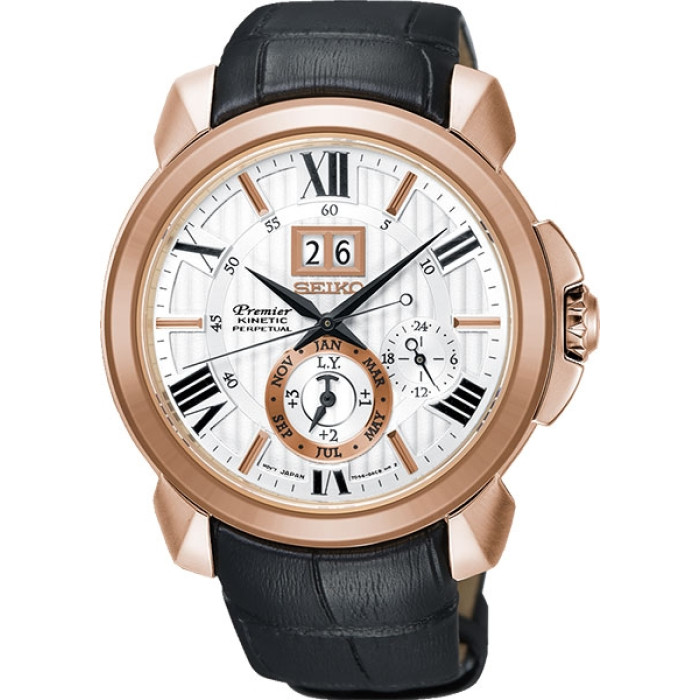 Мужские наручные автокварцевые часы в корпусе из прочной нержавеющей стали с розовым PVD-покрытием. Собственный калибр 7D56. Автоматическая генераторная система Seiko Kinetic. Задняя крышка завинчивается. Высокая степень водозащиты (100 м). Белый циферблат с рельефной поверхностью защищен от царапин сапфировым стеклом. Имеются индексы и римские цифры для обозначения часов, а также арабские цифры для минут и секунд. Вечный календарь на циферблате: индикатор даты под отметкой "12 часов", малый циферблат для обозначения месяца (до 2100 года), указатель високосного года. 12- и 24-часовой формат времени. Функция индикации заряда (EOL). Часы со спящим режимом: переходят в него после 24 часов бездействия для экономии энергии, а при выходе из него устанавливаются в текущее время. Длительность спящего режима до 4 лет. Заводная головка с защитой. Кожаный ремешок с раскладывающейся застежкой. Высокотехнологичные современные часы, в которых идеально сочетается надежность механизма и точность кварца.