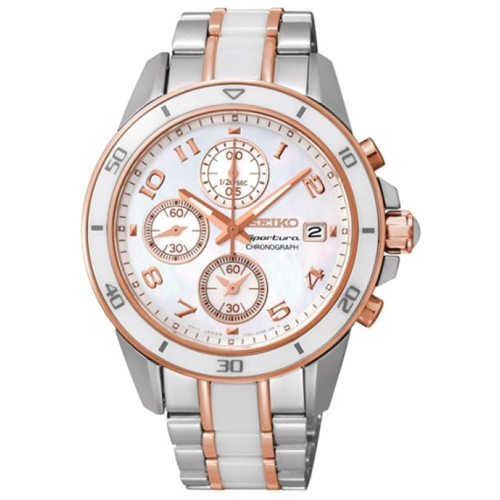 Представленная модель входит в коллекцию Sportura . Это настоящие Женские часы. Материал корпуса часов — Сталь+Золото. Браслет — Сталь+Керамика. Циферблат часов защищает Сапфировое стекло. Часы выдерживают давление на глубине 100 м. Цвет циферблата - Белый. Циферблат модели содержит часы, минуты, секунды. В этих часах используются такие усложнения как дата, хронограф. Диаметр корпуса 38мм.