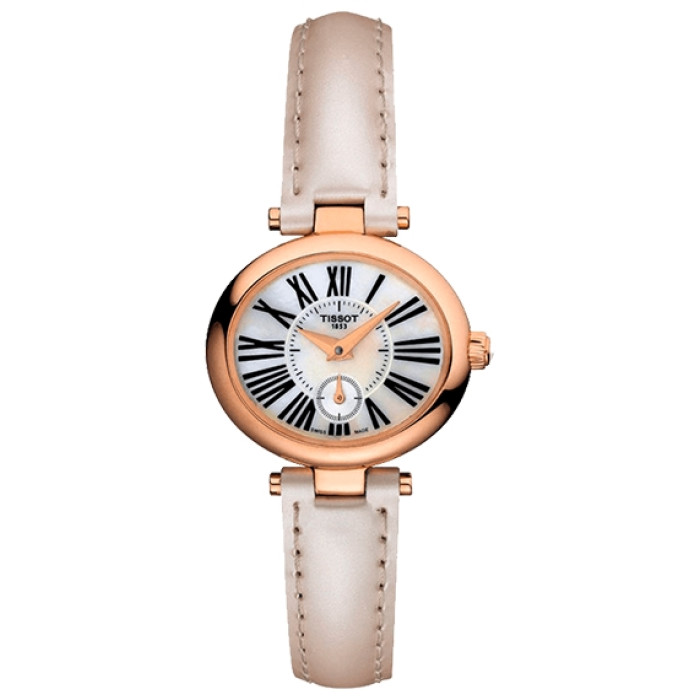 Роскошный облик часам придает и овальный корпус из 18-каратного золота, обрамляющий перламутровый циферблат с минутной шкалой и делениями с римскими цифрами в прекрасном старомодном стиле.