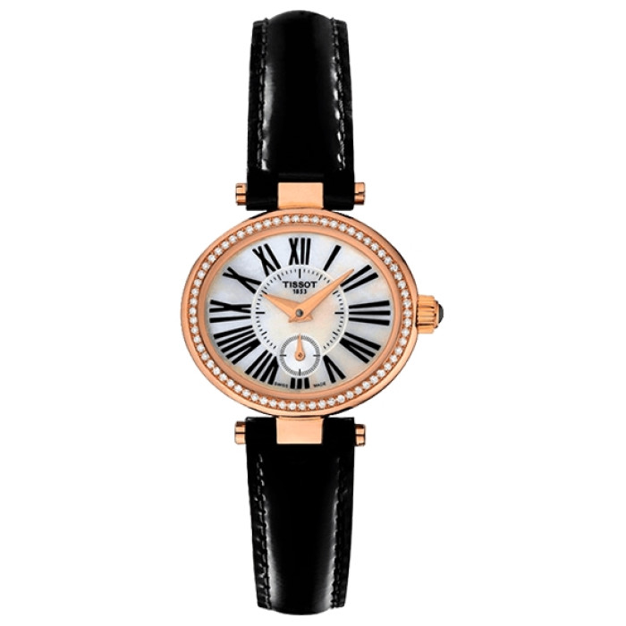 Роскошный облик часам придает и овальный корпус из 18-каратного золота, обрамляющий перламутровый циферблат с минутной шкалой и делениями с римскими цифрами в прекрасном старомодном стиле.