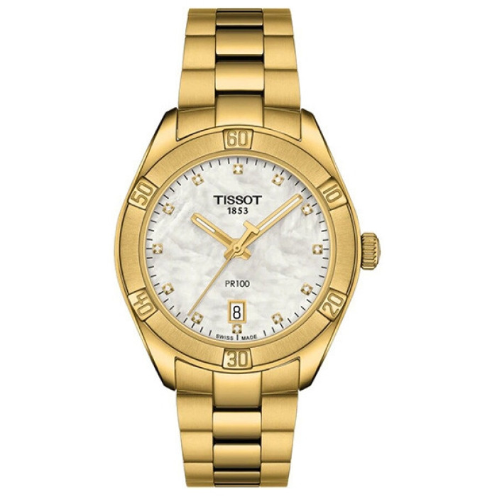 Их отличает элегантный перламутровый циферблат с 12-ю бриллиантами. Корпус часов Tissot выполнен из нержавеющей стали, с ПВД покрытием желтого золота и содержит швейцарский кварцевый механизм. Стальной браслет с раскладной застежкой с кнопками золотистого цвета дополняет роскошный облик этой классической модели.